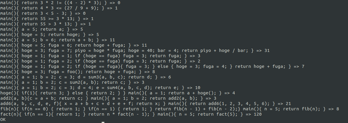 このブログを上げた次の日である 6/28 に,欠陥に気づいてちょっとソースコードをいじると引数ありの関数定義がうまく動くようになりました.再帰呼び出しも原理的にはうまくいくことが分かってはいたのですがいざフィボナッチ数列を食わせて正常に動作するのを見ると感動しました.